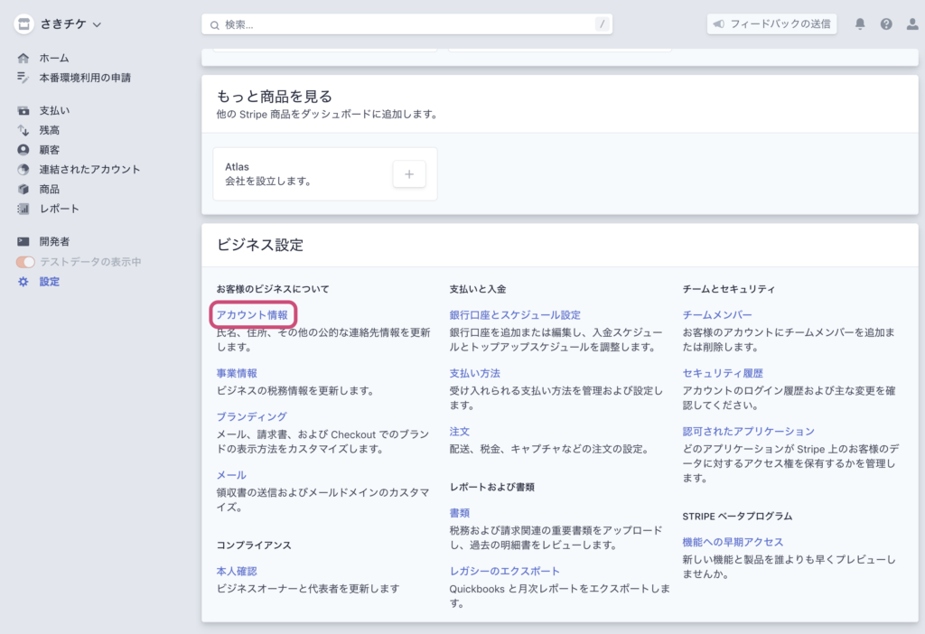 ダッシュボードの設定画面から[事業情報]をクリック