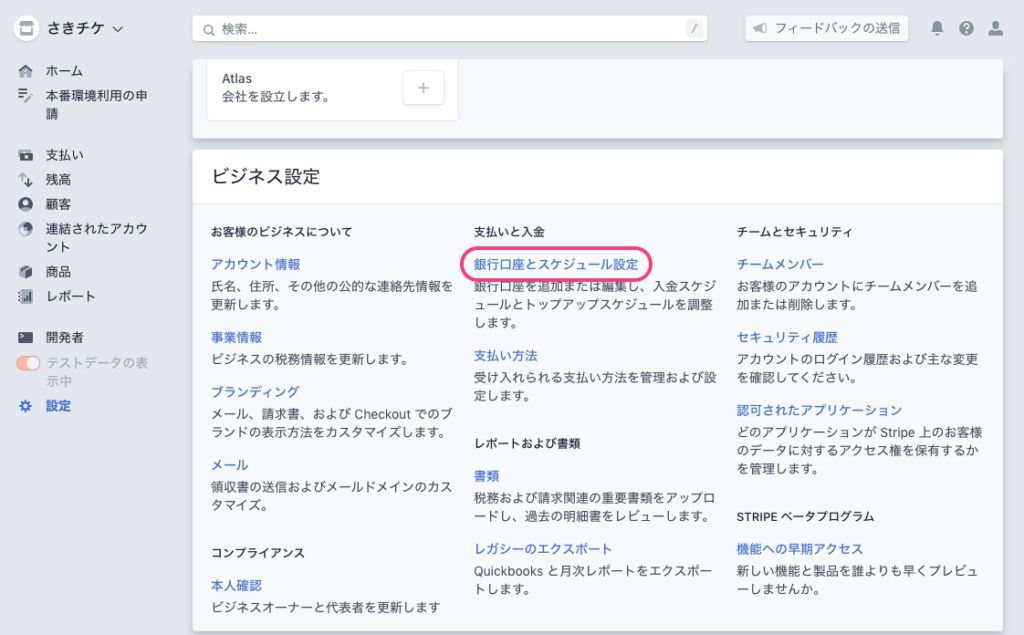 アカウント情報、事業情報、銀行講座の登録