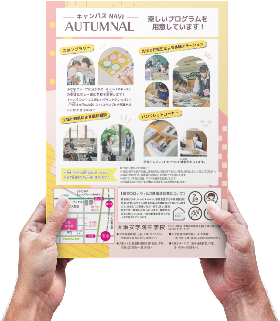 大阪女学院の中学校キャンパスナビAUTUMNALプロモーションアイテムが依頼されました。新型コロナウイルスの影響を受ける中でも、魅力的なキャンパス体験を提供するため、学校の様子や生徒が楽しげに過ごす様子を基にした素敵な写真素材を使用し、ペーパースタンドに入れるために少し厚めの紙を使用しています。この素晴らしいアイテムはヨレにくい仕上がりとなっています。