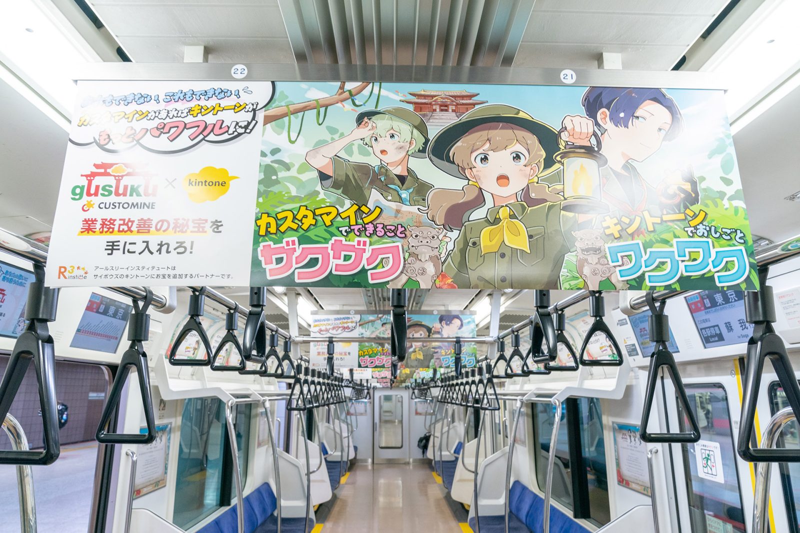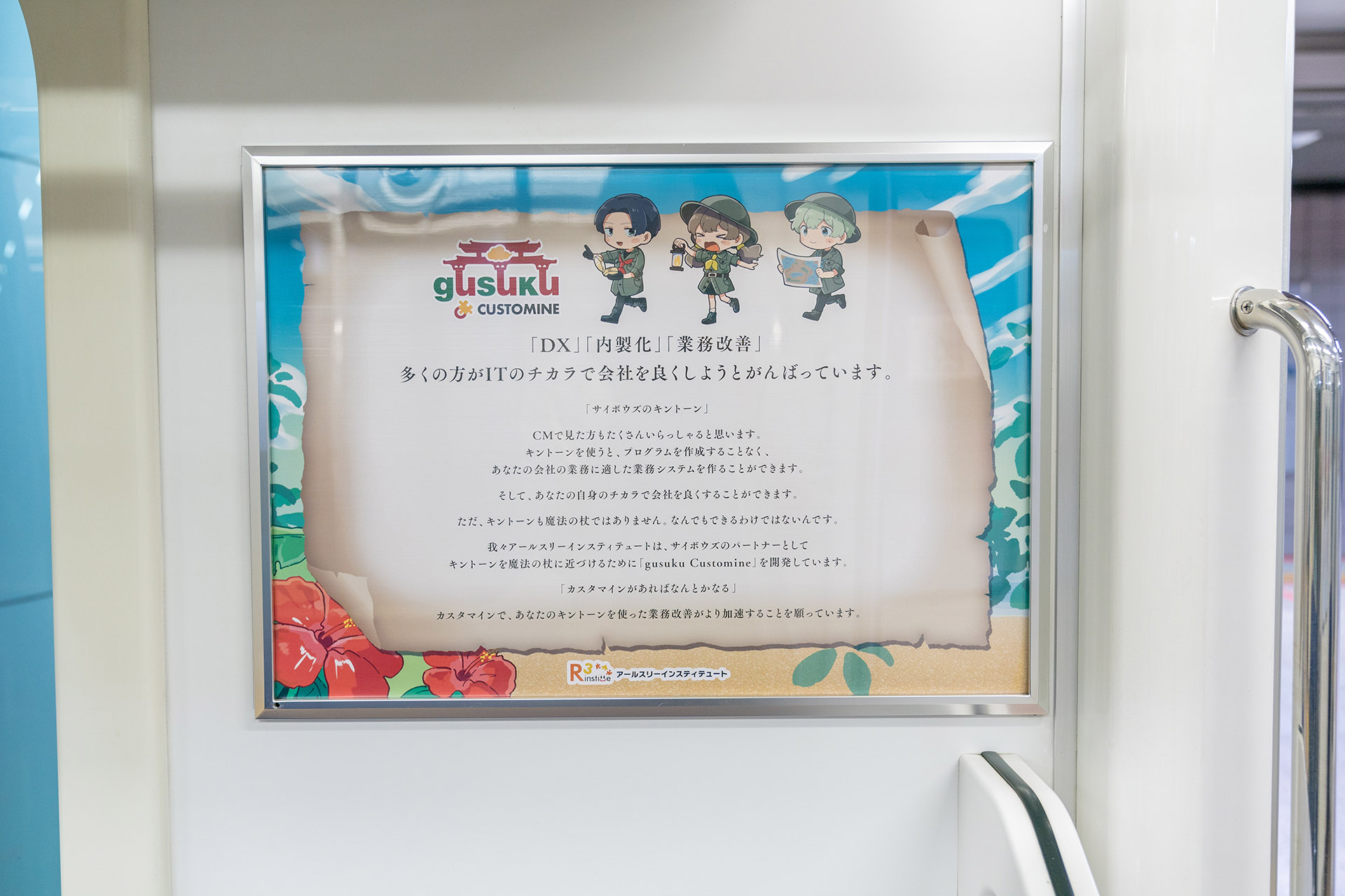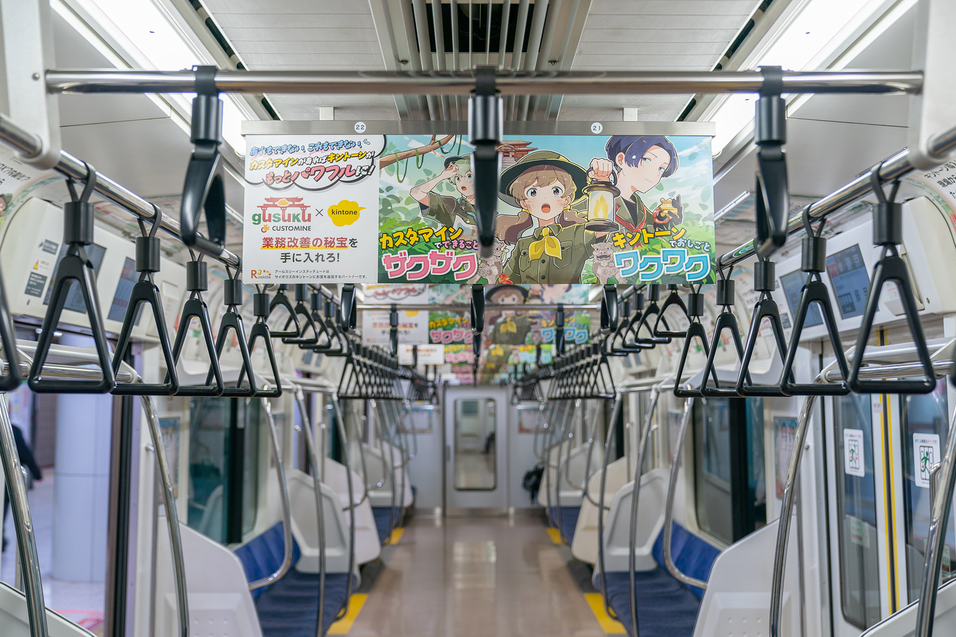 アールスリーインスティテュートは、kintone(キントーン)アプリを活用したシステム開発で数多くの実績を持つシステム開発会社です。昨年の京葉線ジャックに続き、今回はJR埼京・りんかい線中づり貸切広告ビジュアルデザインを制作いたしました。今回は前回よりも大幅にパワーアップし、ADトレイン&駅広告を掲載しています。