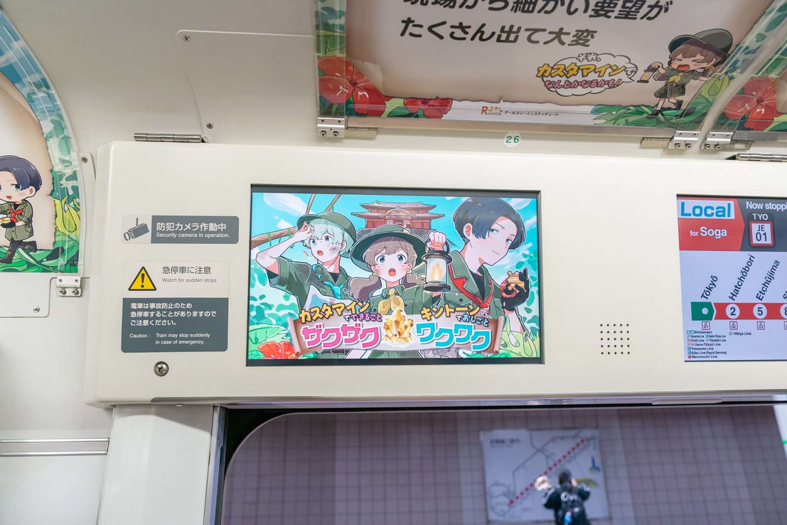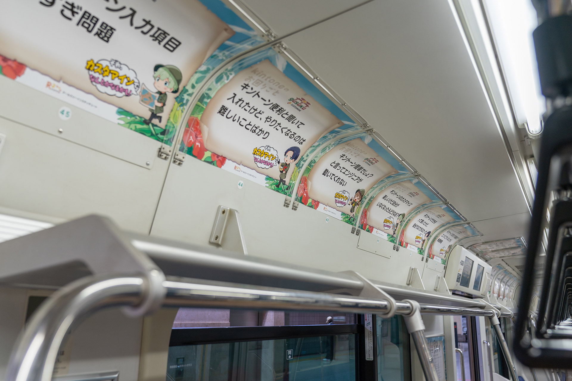 このプロジェクトでは、電車内全体をカスタマイン1色に染め上げ、大きなインパクトを与えるビジュアルを制作しました。